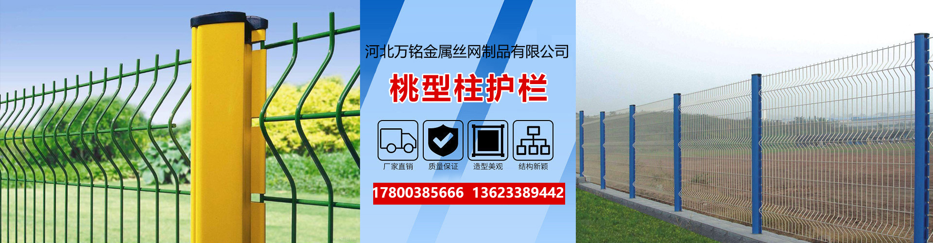 河北萬銘金屬絲網(wǎng)制品有限公司主要產(chǎn)品有:車間隔離柵、桃型柱護欄、圈地護欄網(wǎng)、鋼板網(wǎng)護欄、框架護欄、機場圍界、監(jiān)獄護欄網(wǎng)、鐵路護欄網(wǎng)、體育場圍網(wǎng)等產(chǎn)品,萬銘擁有自己的工廠實體、技術(shù)設(shè)備,可自行設(shè)計和根據(jù)客戶要求生產(chǎn)各種型號護欄。
